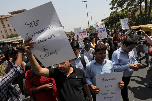 Foto: Journalists protest against the arrest of journalists for their posts on social media in New Delhi in 2019. REUTERS/Anushree Fadnavis