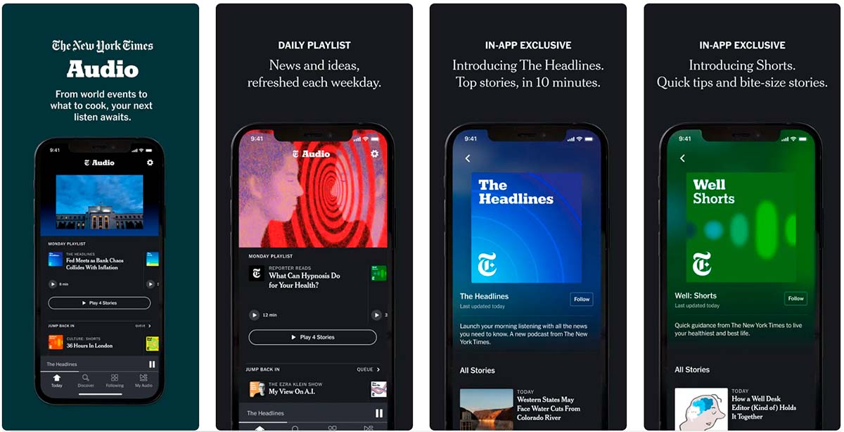 “El New York Times anunció el lanzamiento de su nueva aplicación de audio, New York Times Audio, que ofrece programas exclusivos, reportajes y artículos en audio. La aplicación incluye una programación diaria seleccionada por periodistas y editores de Times, en una amplia variedad de temas: noticias, política, arte, negocios, tecnología, cultura, estilo de vida, deportes y opinión”.